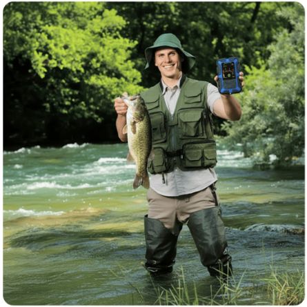 На экране IPS 256 тыс. цветов — чёткая картинка даже на солнце и мелководье. Батарея 4250 мА·ч работает до 30 часов, корпус — ударопрочный и водонепроницаемый IP67.